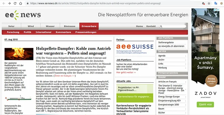 Am 7. August 2018 ist auf dem Schweizer Nachrichtenportal für erneuerbare Energien ein Artikel über unseren Raddampfer publiziert worden. Hier der Link dazu: https://www.ee-news.ch/de/article/39022/holzpellets-dampfer-kohle-zum-antrieb-war-vorgestern-pellets-sind-angesagt